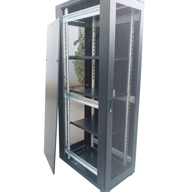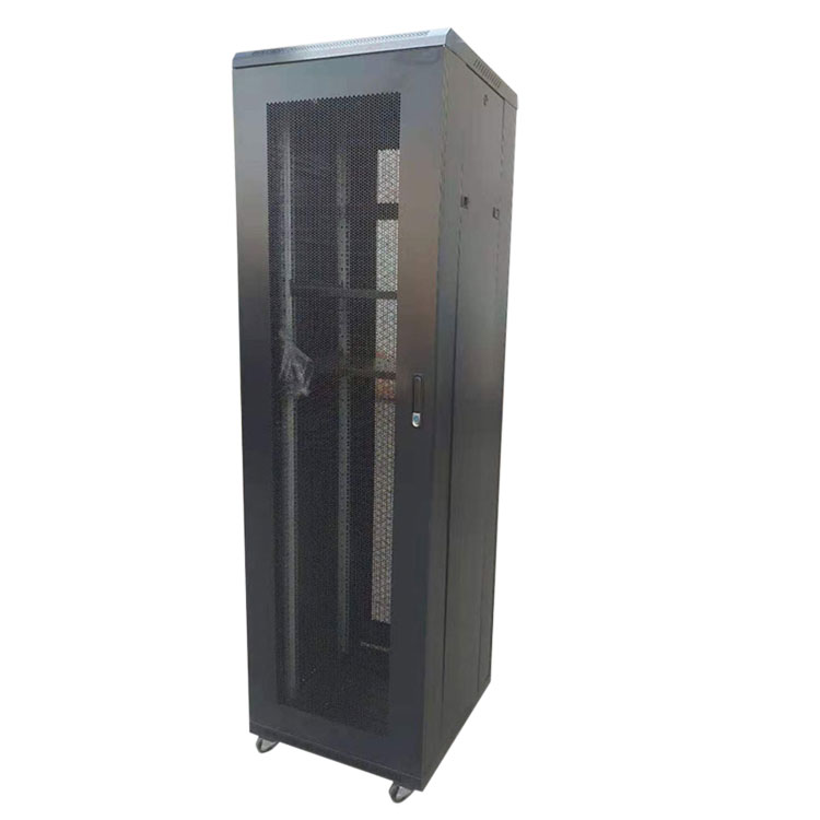 42U机柜外观尺寸高度为2米、宽度0.6米、深度0.6-1.2米不等。配有三块固定层板,2台三人风扇和一个电源排查,前门是钢化玻璃门,后门是钢板网孔门,四个门都可以自由装拆。