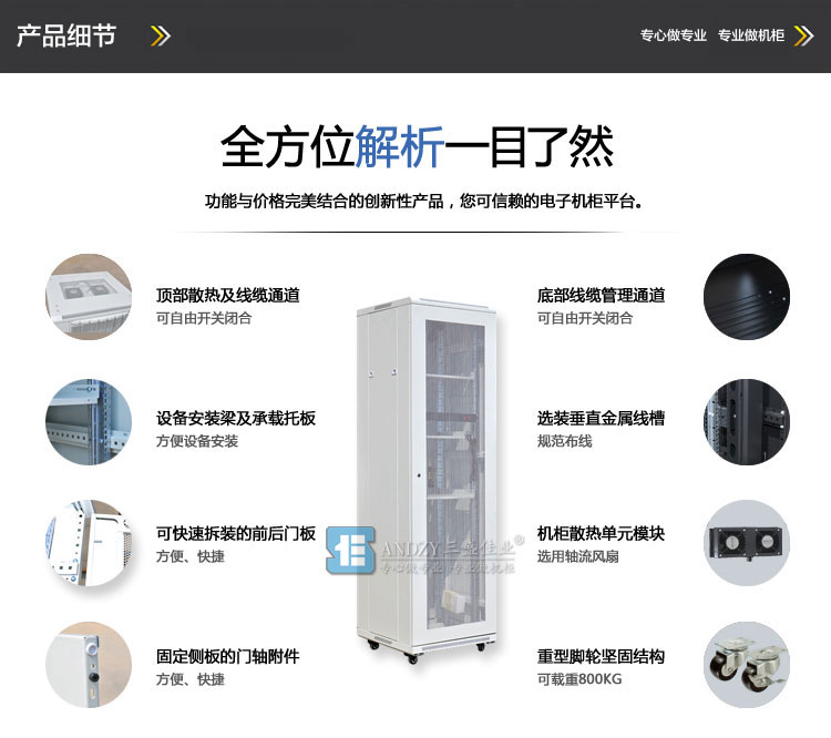 ·平面冷轧钢板后门;前门配黑色旋转锁,后门小圆锁;·顶部安装过滤散热风扇,供设备散热;左右侧门可开,可选配加锁;顶底可调节的进线孔;·底部安装调整脚及万向轮,方便移动,固定及调整水平;·前后焊接框架,可散件出货;